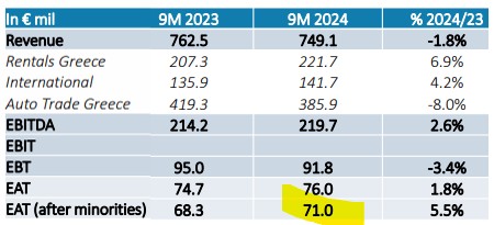 Η Autohellas (ΟΤΟΕΛ) παρουσίασε ενοποιημένα έσοδα 749,1 εκατ. στο εννεάμηνο του 2024, σημειώνοντας πτώση -1,8%.