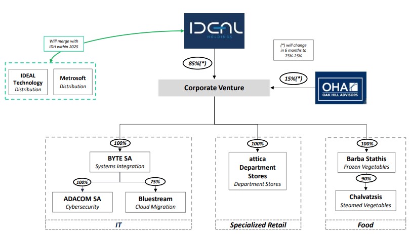 Η Συμφωνία με την OHΑ – Game Changer για την IDEAL. •Δημιουργία νέου εταιρικού οχήματος (Corporate Vehicle – CV) που κατέχει το 100% των βασικών θυγατρικών της IDEAL. •Η Oak Hill Advisors αποκτά (η IDEAL πουλάει) το 15% για €62 εκατ., με δυνατότητα αύξησης στο 25% (επιπλέον 10% έναντι €41 εκατ.). •Η πώληση γίνεται με premium σε σχέση με την τιμή που αγόρασε η IDEAL •Αποτίμηση στα €8,54 ανά μετοχή.