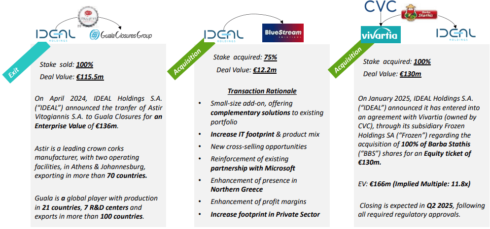 Η IDEAL εμπλούτισε το επενδυτικό της χαρτοφυλάκιο μέσω στοχευμένων εξαγορών: 🔹 Bluestream Solutions (75% για €12,2 εκατ.) – Ενίσχυση στην πληροφορική και το cloud computing. 🔹 Μπάρμπα Στάθης (100% για €130 εκατ.) – Διείσδυση στον κλάδο τροφίμων, με ηγετική θέση στην αγορά (στο 2025)